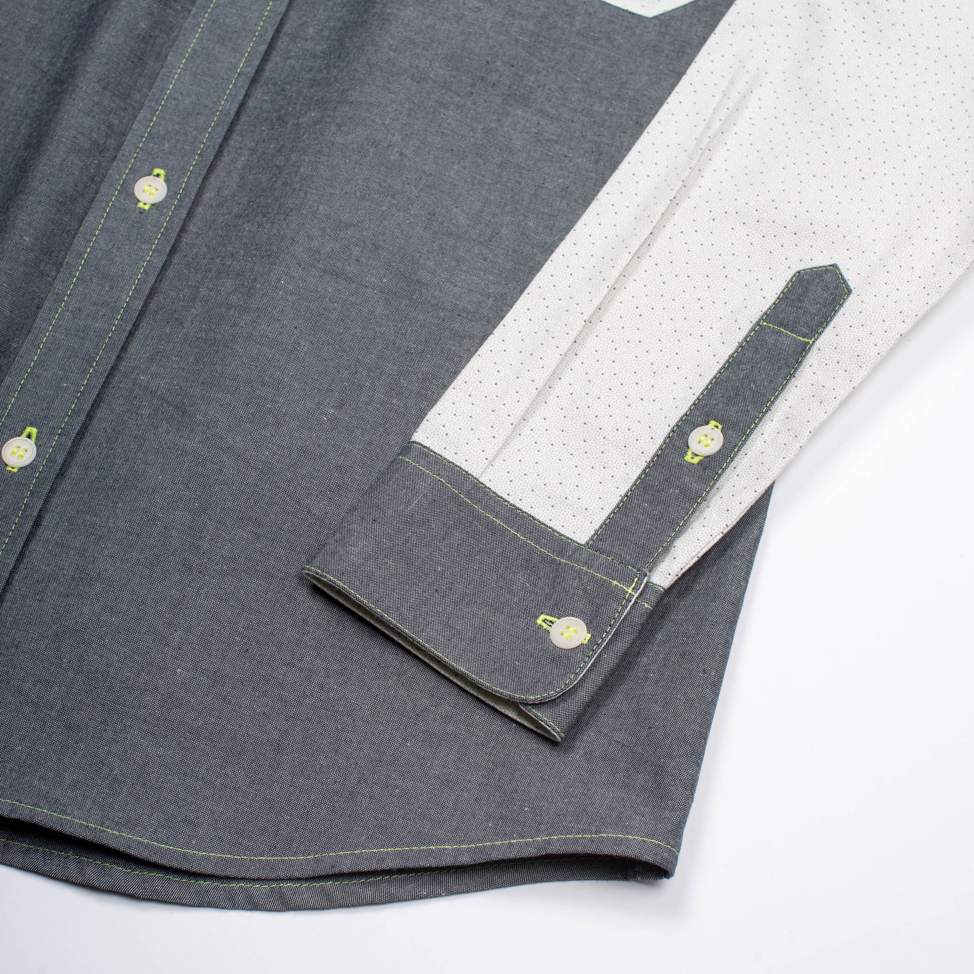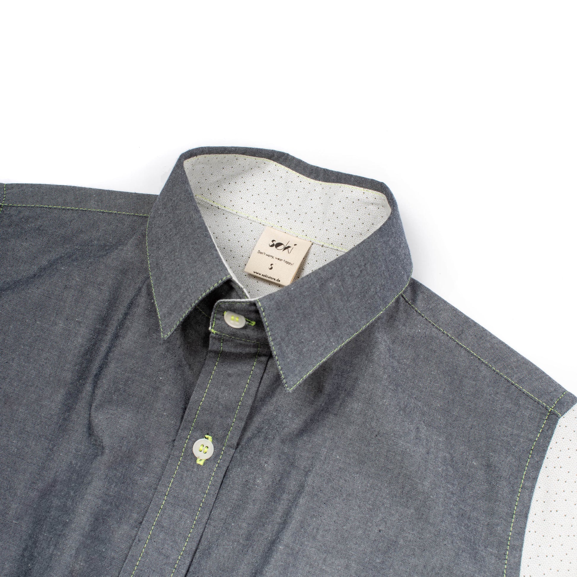 - Einzigartigkeit: Jedes Hemd ist ein Einzelstück mit neon-gelben Nähten.