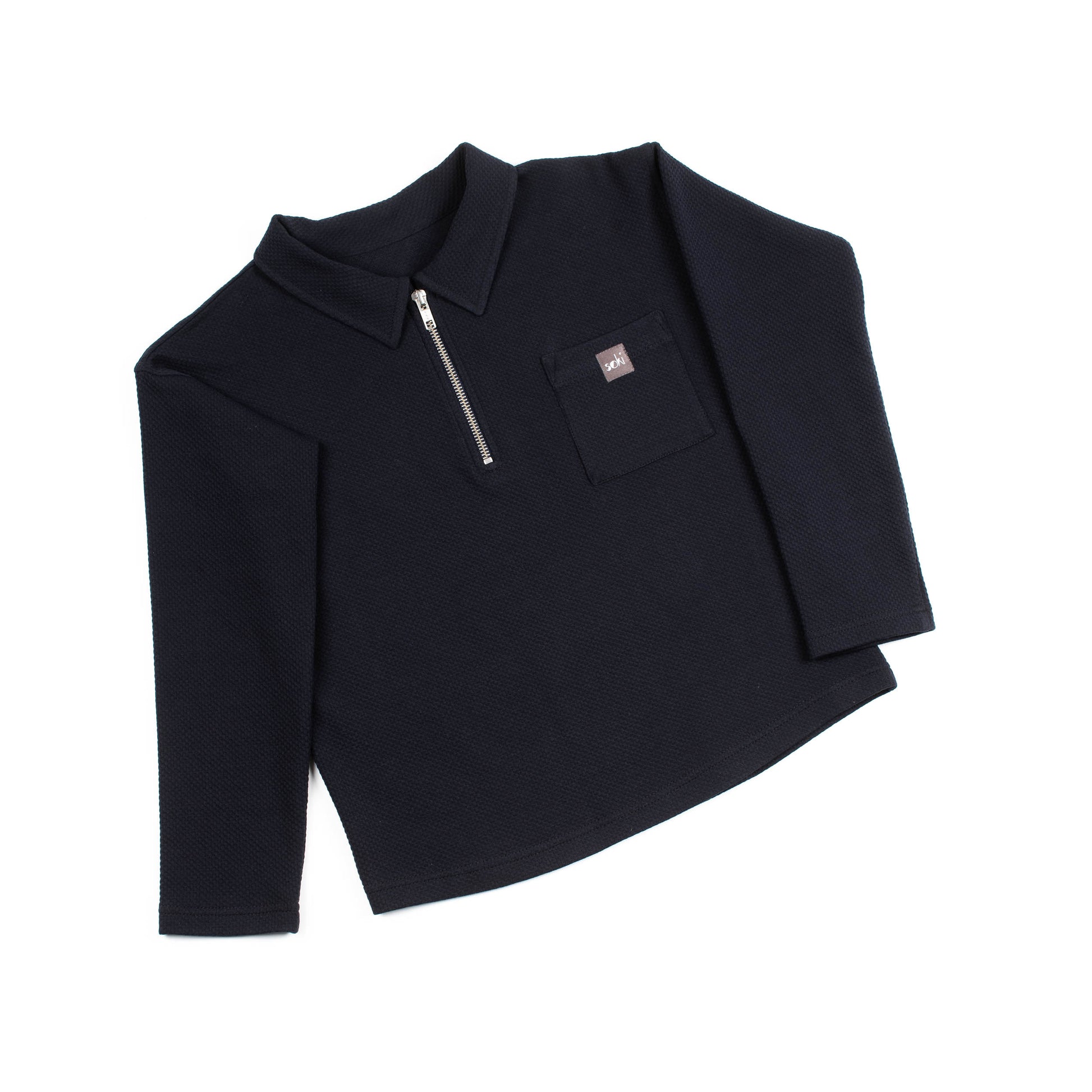 Der Pullover hat einen klassischen Kragen und einen Reißverschluss. Auf der linken Brustseite ist eine Brusttasche mit unserem soki Patch aufgenäht.
