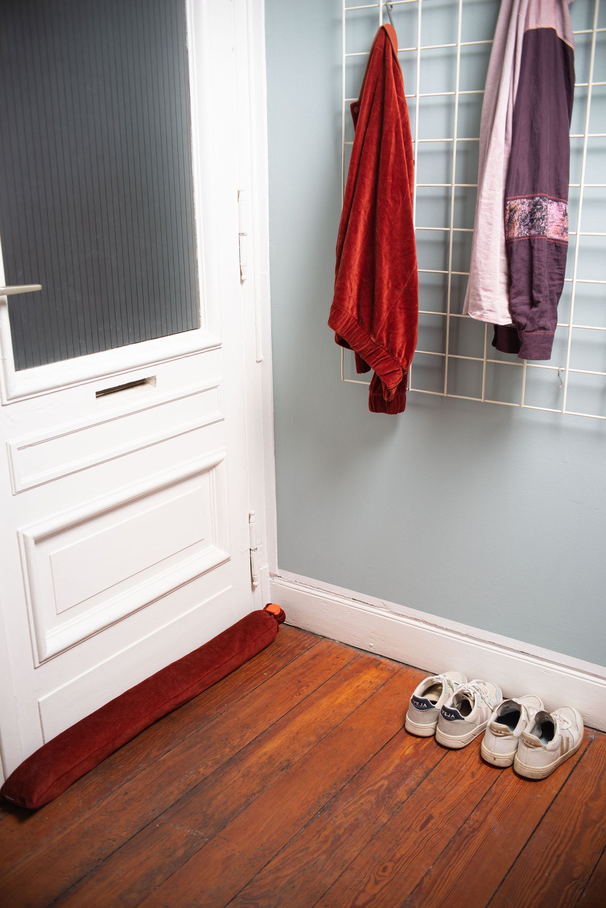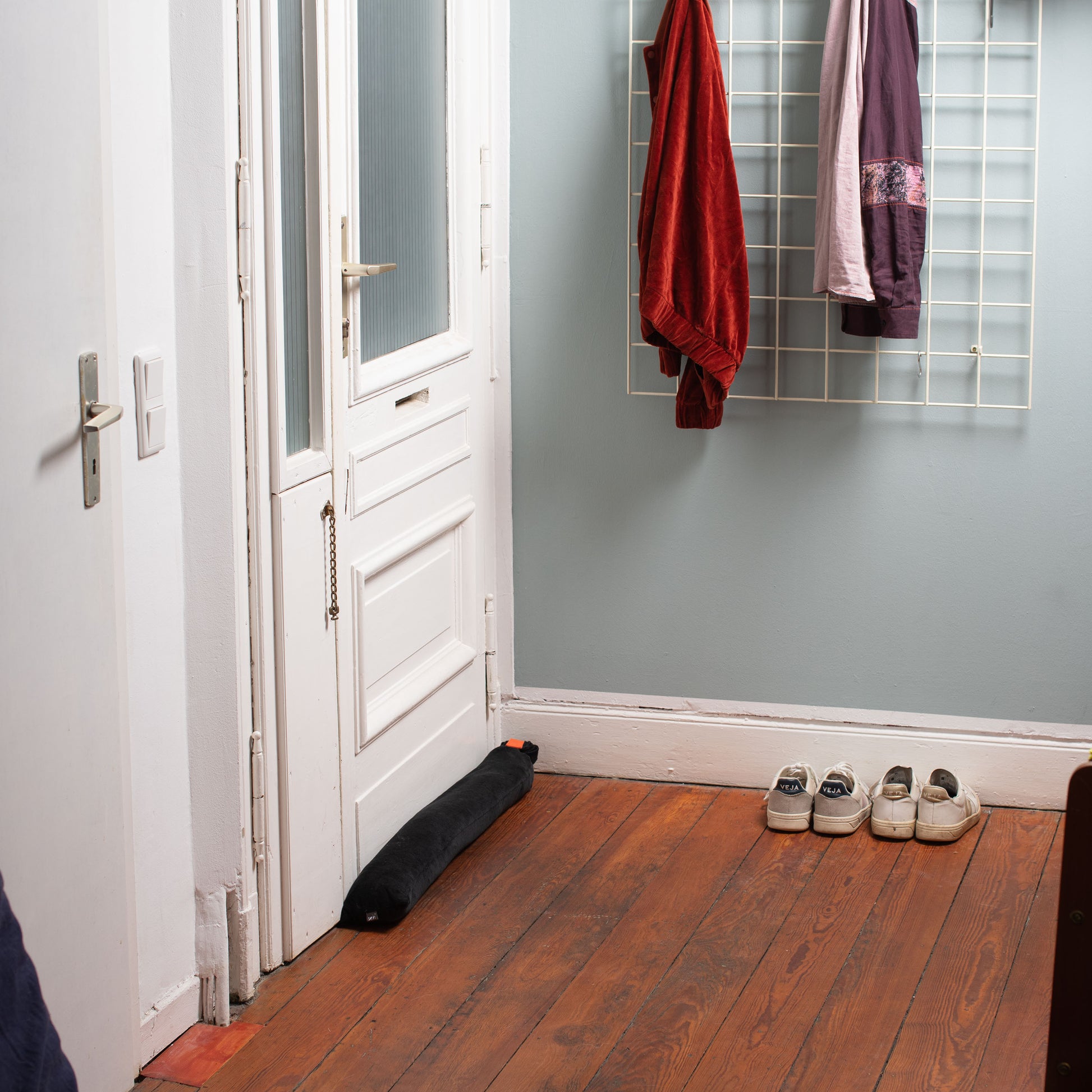 1. Lege den Zugluftstopper von innen vor die entsprechende Tür/Fenster und prüfe, ob die Länge passt.