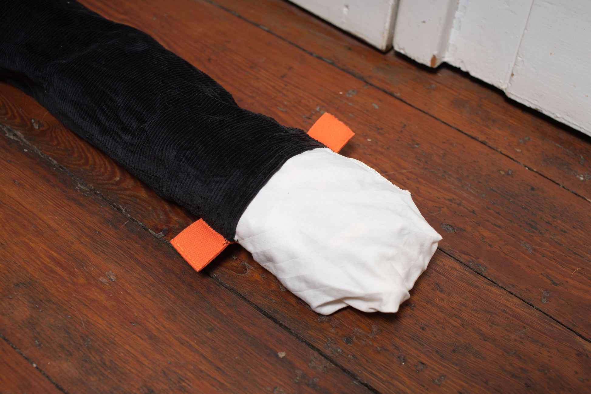 3. Entnehme der beiliegenden Tüte die weißen Klebeklettquadrate und Klette sie Auf das Flauschband am Zugluftstopper. Platziere diesen nun passend vor gewünschter Tür/Fenster und leg die Position fest. Die Oberfläche, auf die nun die Klettquadrate aufgebracht werden, sollte sauber und fettfrei sein. Entferne als Nächstes das Papier von den Klettquadraten und drücke sie an die Tür/Fenster.
